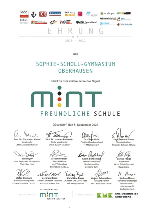 Erneut hat das Sophie-Scholl-Gymnasium für drei Jahre das Signet MINT freundliche Schule erhalten. Ein großes Dankeschön geht an die Kolleg:innen, die in diesem Bereich unterrichten, ohne deren Engagement diese Auszeichnung nicht möglich gewesen wäre. Herzlichen Glückwunsch.