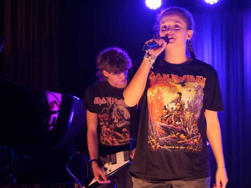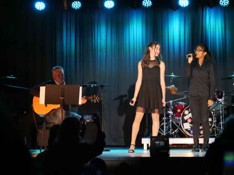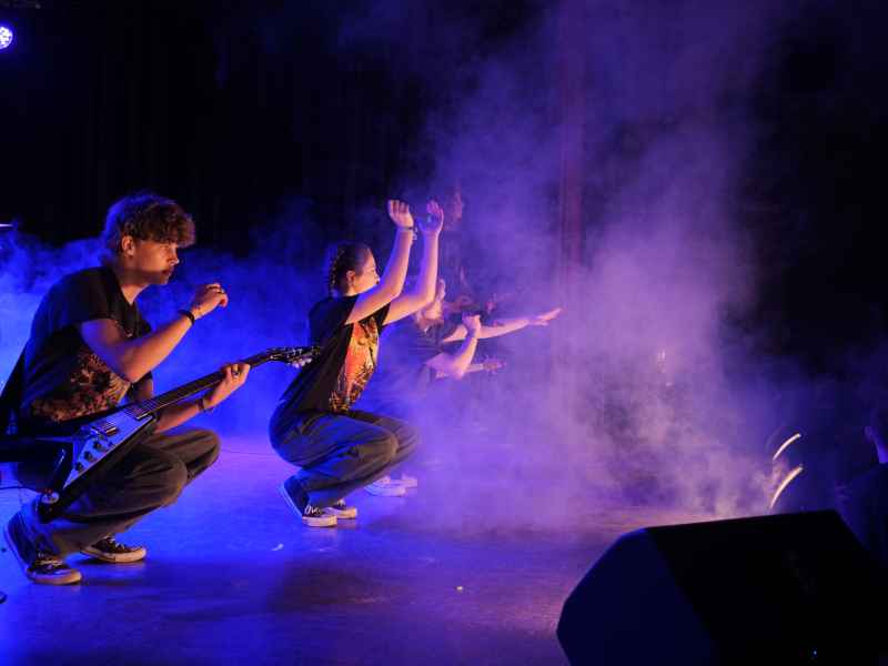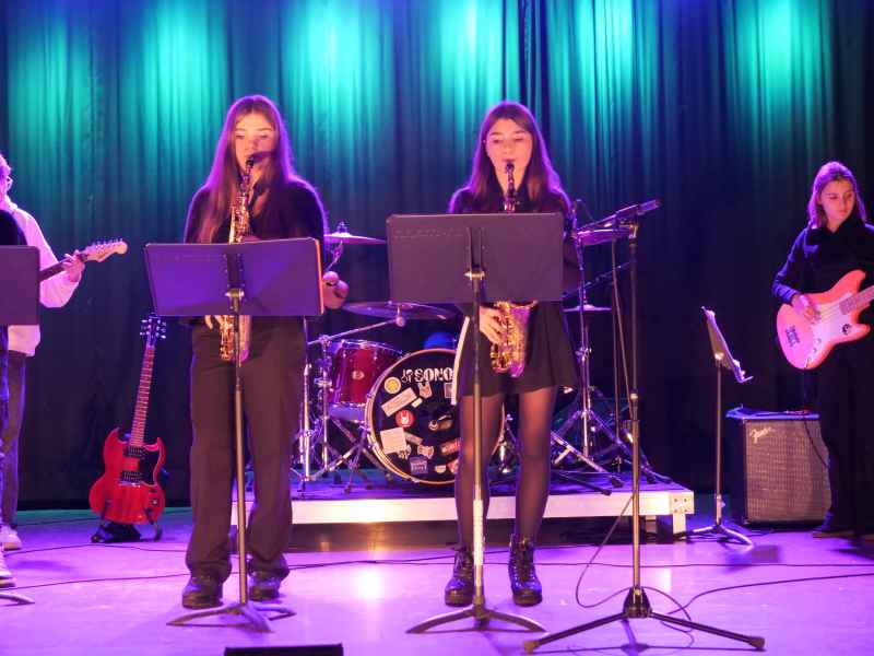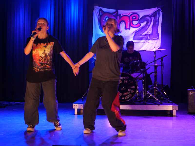 Die Schulband One 21 – bestehend aus Liese Bäcker und Milena Rohrbach am Gesang, Carlo Camminadi und Luca Jordan an den Gitarren, Johanna Voss am Bass sowie Markus Spiegel an den Drums – rundete die Abende mit energiegeladenen Rocknummern ab. Die Songs „Shut Up and Dance“, „Schrei nach Liebe“ und „Pretty Fly“ brachten die Aula zum Beben, so dass die Band nicht ohne Zugaben die Bühne verlassen durfte.