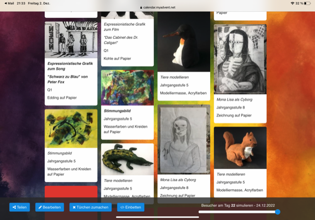 für die restlichen Tage bis Weihnachten könnt ihr / können Sie die schönen Kunstwerke der Schülerinnen und Schüler im digitalen SSG- Kunst-Adventskalender bewundern. Unter den Kunstwerken sind grafische, plastische, fotografische und malerische Arbeiten zu finden, die von Schülerinnen und Schülern aus unterschiedlichen Jahrgangs- stufen erstellt wurden. Sie können den Adventskalender hier besuchen.